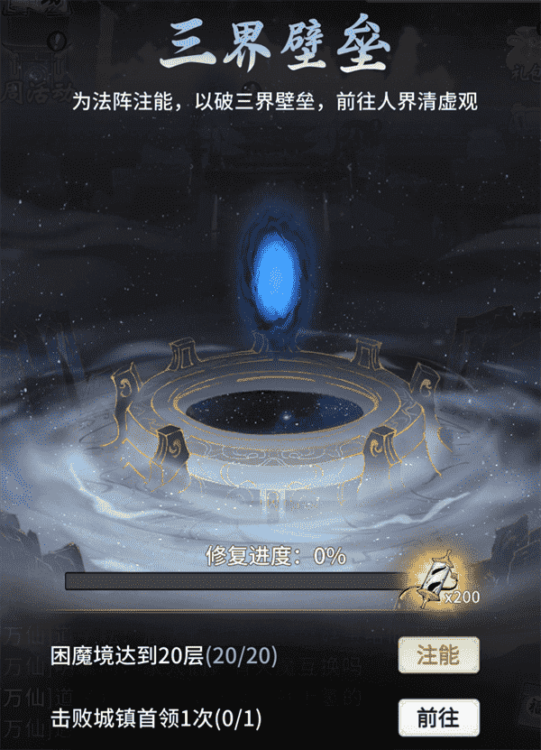 当你修为达到返虚/破虚中期后,,,可在城镇寻得芸丫并激活神秘法阵,,通过收集材料、、、击败首领等方式为法阵注能,,,借以打破三界壁垒,,,开启支线剧情“清虚旧梦”