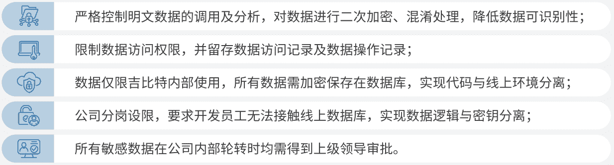 公司对用户个人信息实施脱敏处理,,,严格限制用户信息用途,,,,数据使用完成后集中归档处理。。。。为进一步确保数据处理过程的安全,,,公司根据实际的业务工作分岗设限,,最大程度保护数据隐私安全,,,,如在生产网络中的加密数据由研发部门员工负责编写加、、、、解密程序,,,但其无法直接访问到加密后的数据库;程序的加、、解密密钥由运维员工单独配置。。