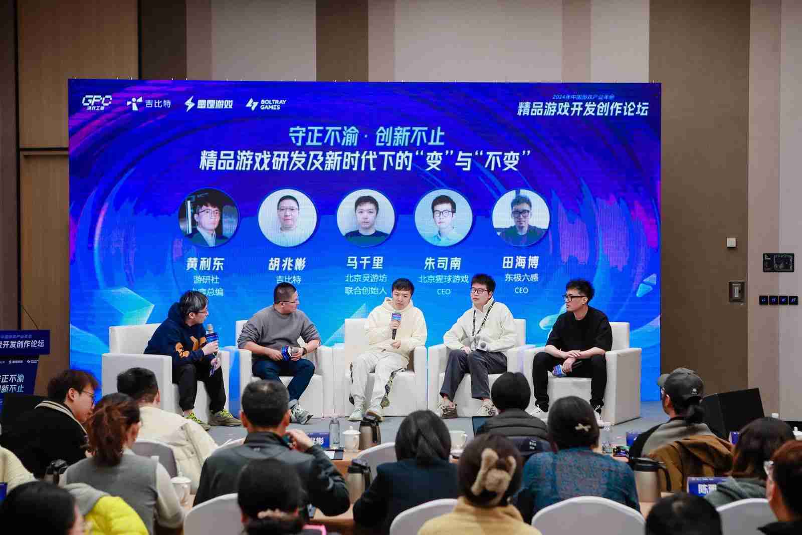 圆桌对话环节,,,在游研社内容总编黄利东的主持下,,,35273CTO胡兆彬、、、、北京灵游坊联合创始人马千里、、北京猩球游戏CEO朱司南、、、、东极六感CEO田海博等四位嘉宾围绕“守正不渝、、创新不止——精品游戏研发及新时代下的‘变’与‘不变’”这一主题分享了各自在精品游戏开发理念及工程能力搭建方面的见解和经历,,,并就行业变化下游戏人需要坚守的理念等展开交流探讨。。