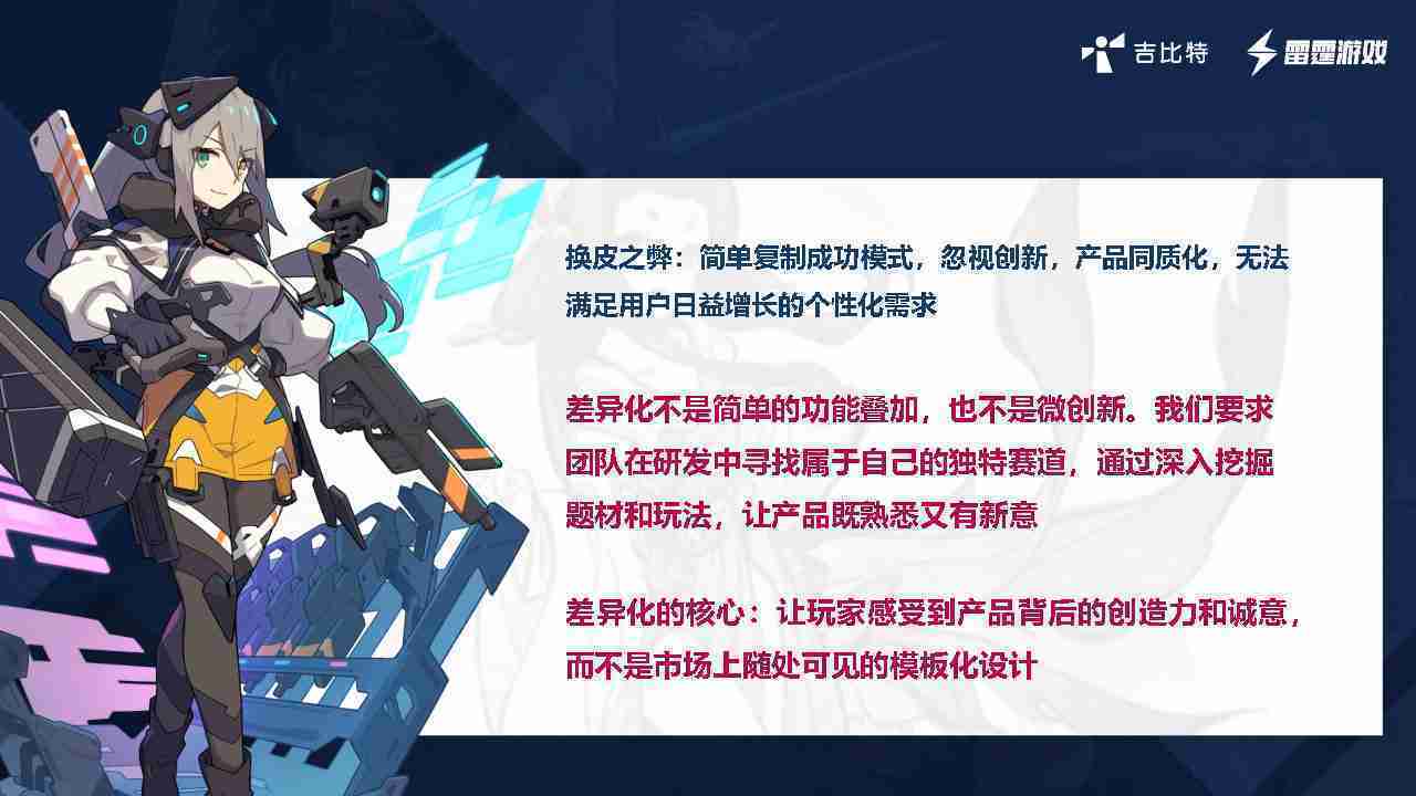 在我们内部是这么定义差异化的。。。首先,,,差异化不是简单的功能叠加,,更不是换皮。。。只是换皮,,,,产品无法提供有效的市场价值。。。内部经常说差异化的产品不是为了迎合市场,,,,而是找到一个自己独特的表达方式,,在研发中找到属于自己的细分赛道和独特赛道,,,,前提是需要对这个题材有足够的深入、、、、挖掘,,对玩法有足够深入的理解,,让产品看起来既熟悉又有新意。。。