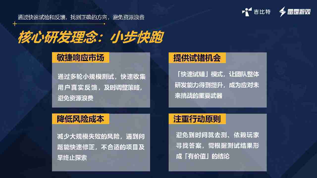 小步快跑不是找答案,,,,而是验证答案。。。我们之前有项目是这样的,,有些制作人会有几个方向觉得都可以做,,,,但是不确定做哪一个,,,会选择几个都做,,做完拿到市场跑,,,跑出哪一个更好,,基于这个再做后续的研发和拓展。。。但这种情况最容易出现一个问题,,,,可能被玩家裹胁,,,玩家说这个点不错、、、那个点不错,,,到底听还是不听,,不听感觉是无视玩家的反馈,,听的话,,可能自己没想清楚导致研发思路发生偏颇。。。所以针对这一点后面自己复盘整理,,,,发现制作人自己心里要有数,,,,要做自己觉得好玩的,,,,而且明确知道这个东西是你想做的,,然后拿到市场验证这个答案是不是对的,,,而不是拿一堆答案找哪一个答案更好。。。。