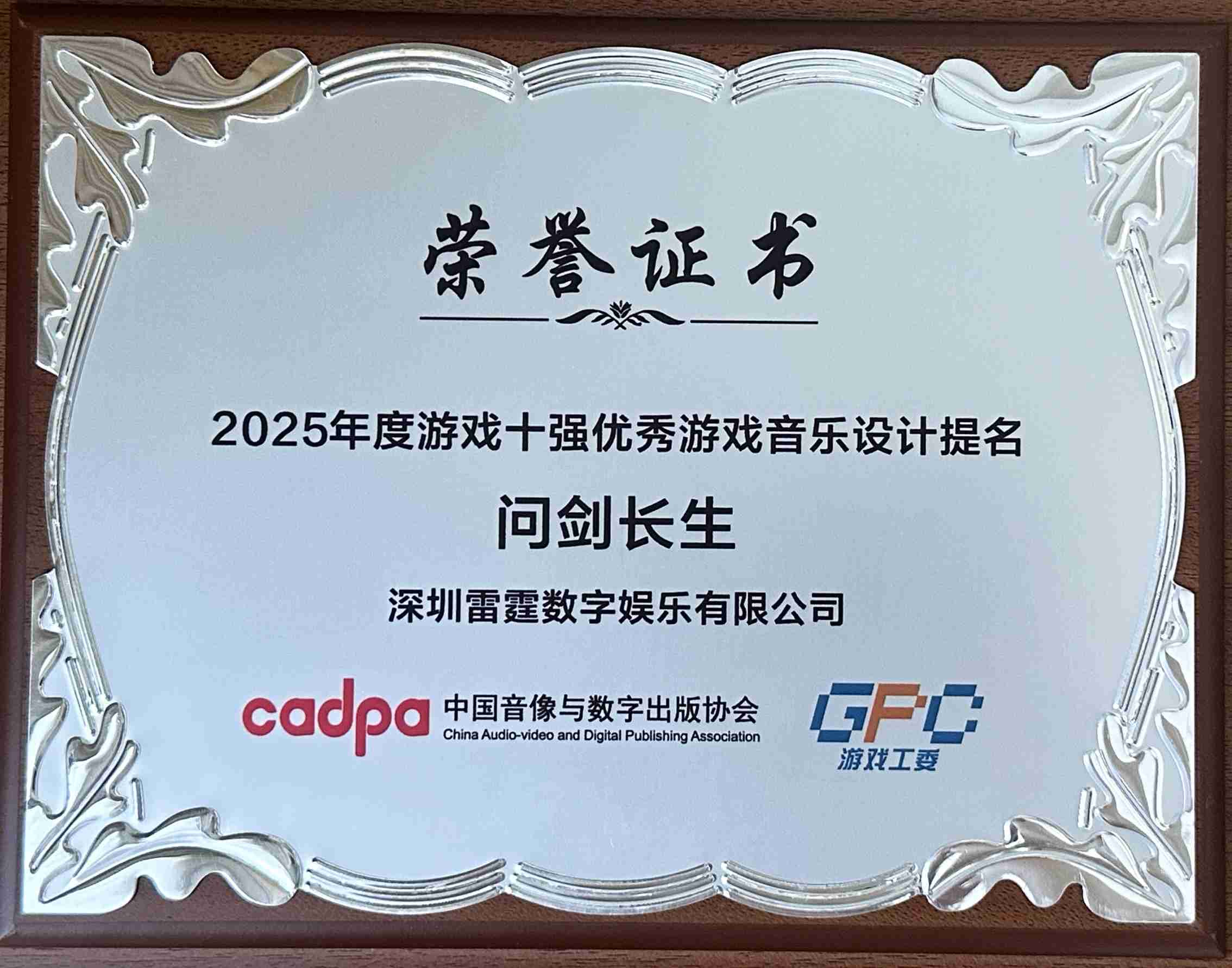 公司坚持走精品化道路,,,,打造与时代精神相契合、、、与海内外大众诉求相契合、、与创作实践相契合的游戏产品,,倡导构建具有中华文化特色、、弘扬中华美学精神的产品理念,,,,切实提升游戏文化内涵的传播力影响力。。。。如此次荣获“2025游戏十强年度优秀游戏音乐设计”提名奖的公司自研产品《问剑长生》以音筑境,,以乐传情,,其音乐融合东方传统韵味与现代审美,,,,构建独特听觉世界,,,,运用古筝、、笛子、、、、箜篌等传统乐器与现代管弦乐,,,塑造灵动古风仙侠氛围。。。。