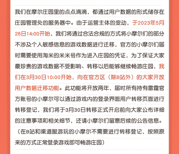 合作结束本就是开发方和代理方双方的事情,,降低这件事情对玩家的影响,,,,才是对所有珍视这段童年的摩尔玩家最好的呵护。。。目前看来,,用户完全不用担心后续因无法登录游戏而造成任何数据上的损失,,,,只要及时进行账号转移,,就可以好好保留、、延续在庄园的痕迹和回忆,,继续在庄园里做快乐的红鼻子小鼹鼠。。
