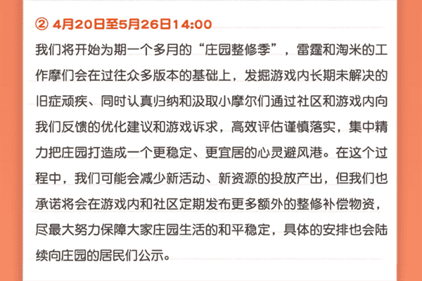 合作的结束并不意味着这个童年IP的结束,,,对于《摩尔庄园》手游而言,,这是一个新阶段的开始。。。后续游戏内将开启庄园重构计划,,,,会就以往遗留下来的BUG进行集中修复,,,并在游戏内和社区定期发布更多补偿物资。。
