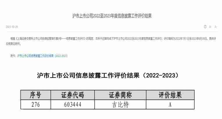 近日,,上海证券交易所(以下简称“上交所”)发布2022-2023年度信息披露工作评价结果。。35273(股票代码::::603444)凭借规范的公司治理、、高质量的信息披露以及良好的投资者关系管理再次荣获信息披露工作A级评价,,公司连续两年获此殊荣。。。
